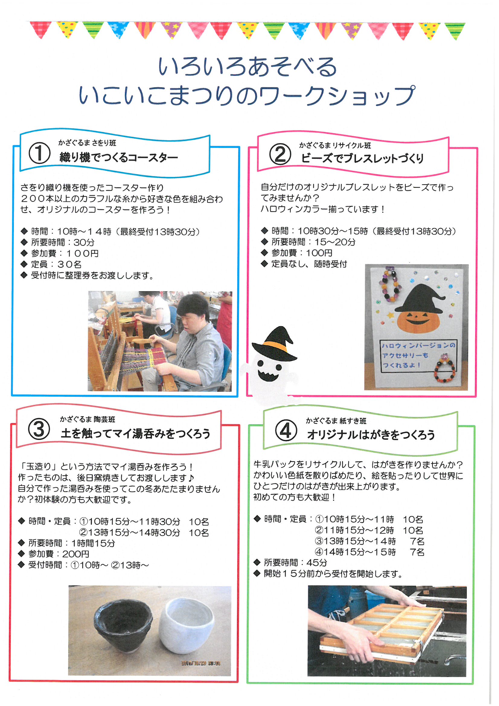 『第1回いこいこまつり』(10月31日(土)開催)では、織り機でつくるコースターや、ビーズでブレスレット作りなど、楽しい体験コーナーが盛りだくさん!